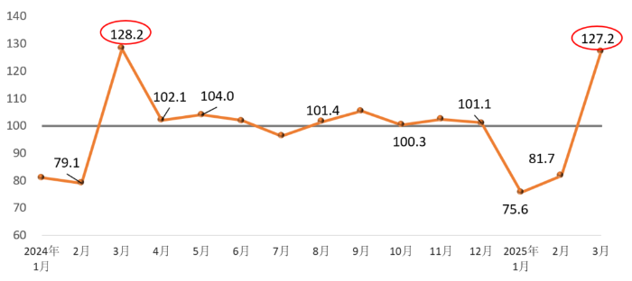 In March 2025, the Building Materials Industry Prosperity Index (MPI) reached 127.2 points, exceeding the threshold and entering the prosperous range. While showing significant recovery compared to January and February, the rebound was less pronounced than in the same period last year.